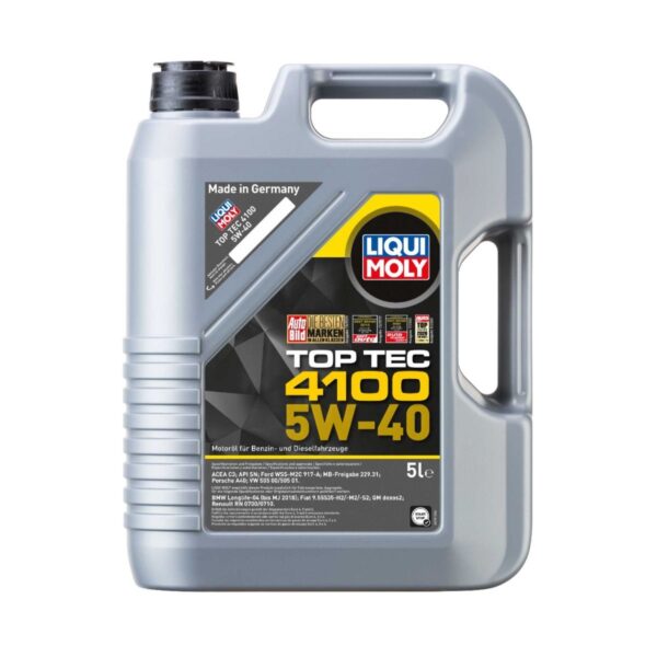 Liqui Moly Top Tec 4100 5W-40 is a modern all-season engine oil. Suitable for gasoline and diesel engines with or without diesel particulate filters (DPF), it is also suitable for many vehicles thanks to its wide range of approvals and specifications. Based on synthetic base oils and enriched with modern additives, Liqui Moly Top Tec 4100 5W-40 guarantees effective wear protection and exceptional cleaning power. This Liqui Moly engine oil ensures low fuel consumption, thanks to improved engine oil flow properties. Liqui Moly Top Tec 4100 5W-40 meets the requirements of the Euro 4 and Euro 5 emissions standards. This passenger car engine oil is also suitable for gas-powered engines.