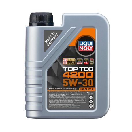 Liqui Moly Top Tec 4200 5W-30 is a versatile engine oil with a wide range of approvals and specifications. Liqui Moly Top Tec 4200 5W-30 is a special low-viscosity oil for gasoline and diesel engines with and without diesel particulate filters (DPF) – even with retrofits (exception: TDI engines R5 and V10 built before June 2006). Unlike many other engine oils, this Liqui Moly engine oil complies with the Euro 4, Euro 5, and Euro 6 emissions standards. Liqui Moly Top Tec 4200 5W-30 offers outstanding wear protection while simultaneously reducing oil and fuel consumption. Using Liqui Moly Top Tec 4200 5W-30 engine oil allows for oil change intervals of up to 30,000 kilometers (gasoline) or 50,000 kilometers (diesel). Otherwise, an oil change would only be necessary after two years. The Liqui Moly Top Tec 4200 5W-30 engine oil is also suitable for gas-powered engines. Overall, this engine oil impresses with its wide range of applications and outstanding performance characteristics.