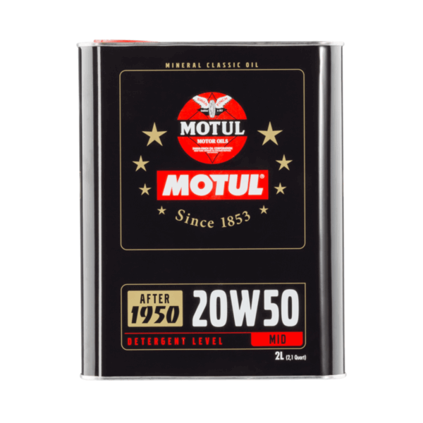 Motul Classic Oil 20W-50 is one of four Motul classic car engine oils and the only mineral multigrade oil among them. Based on the API SF and API SC standards, Motul Classic 20W-50 engine oil is suitable for all classic cars built between 1950 and 1970. The special feature of this classic car engine oil is its particularly mild alloy and multigrade properties. This makes Motul Classic Oil 20W-50 suitable for year-round use. Motul Classic Oil 20W-50 also prevents increasing wear on and in the engine. Furthermore, this engine oil does not attack seals or bearing metals (bronze, copper, and brass) in classic cars.